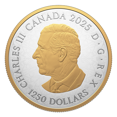 这枚精制铂币的正面图案以英国现任国王查尔斯三世的金色浮雕肖像为主体,头像以写实手法刻画,细节清晰,体现出君主肖像的庄重感。背景衬以激光雕刻的百合纹理,与背面主题产生细腻的关联。肖像周围环绕“国王查尔斯三世·蒙上帝恩典”“加拿大”字样、年号及面额。币缘的镀金处理,则与金色浮雕头像形成色彩上的呼应,让正面的视觉元素更显协调统一。