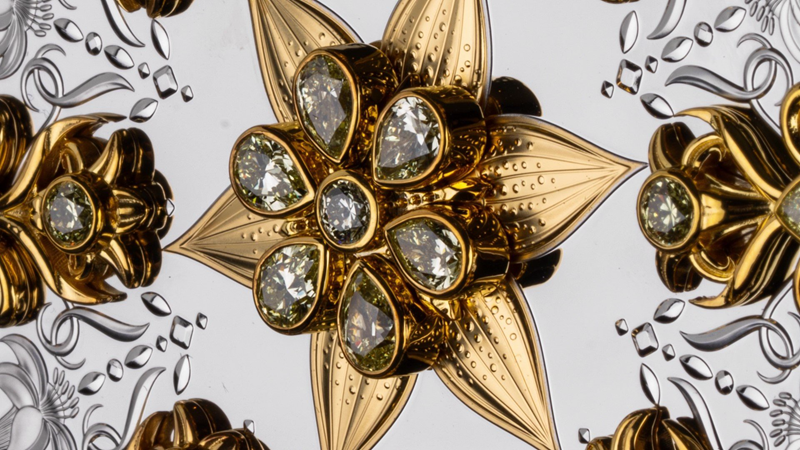 镶嵌于18K金托中的23颗珍稀黄钻,来自加拿大西北地区的埃卡蒂钻石矿,是天然钻石中罕见的品种,这批黄钻见证了长达一年多细致入微的开采、切割和抛光过程。每一朵百合造型上镶嵌的黄钻采用了圆形切割或梨形切割手法,前者能更好展现黄钻的火彩;后者切割的造型与花饰曲线更为适配。这些黄钻经过严格筛选,色泽均匀、净度较好,它们不仅是装饰元素,其本身的珠宝属性也极大提升了这枚精制铂币的价值。