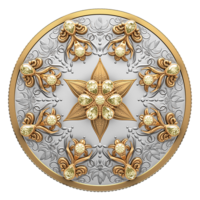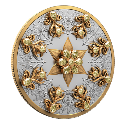 作为贵金属纪念币,它的奢华工艺细节也体现了创作的用心:加拿大百合造型的花瓣轮廓和花饰曲线立体饱满,视觉上极具张力;币面的暖黄金色与铂的冷白色调形成视觉上的鲜明对比,既突出了图案,也增添了璀璨感;每朵百合造型都镶嵌黄钻,镶嵌位置与花瓣轮廓十分契合;百合花纹背景线条流畅,为币面增添细节的同时,让整体质感更显细腻。这些工艺的结合,让币面既有铂的厚重,又有浅浮雕、珠宝镶嵌等工艺带来的精致质感,每处细节都体现了生产上的精益求精。