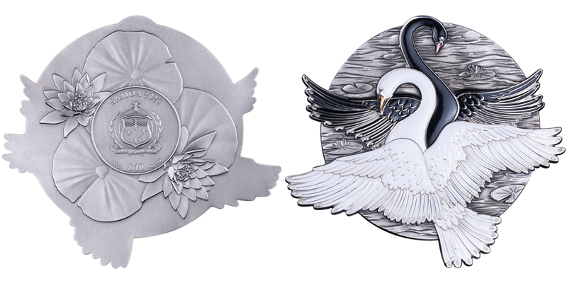 近日,由萨摩亚发行、德国钱币商MDM Wholesale开发设计和总经销的“黑白天鹅”仿古银币震撼上市。这枚仿古银币传神地捕捉了天鹅的优雅气质,以创新设计诠释爱情的忠贞,堪称不可多得的硬币珍品。该枚仿古银币重量为500克,成色为99.9%,尺寸为121.3毫米x110毫米,面额为10元,发行量为399枚。