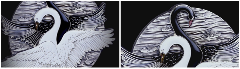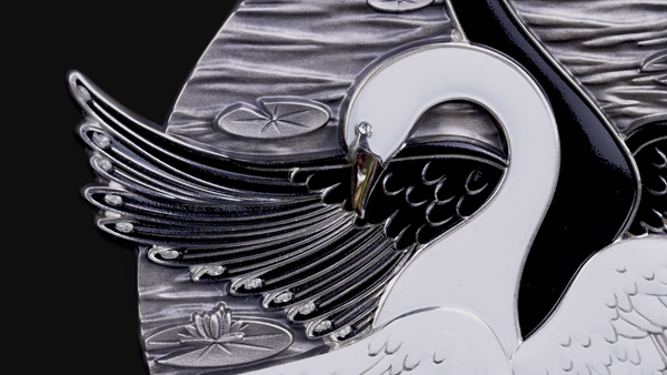 这枚仿古银币所展现出的工艺水准,更值得细细品鉴。首先,贵金属的温润光泽与做旧处理后的复古质感相互交融,触感与视觉感俱佳。其次,彩色珐琅工艺的运用炉火纯青,黑白珐琅填色均匀细腻,色彩饱和度极高,既保证了色彩的持久度,又让黑白天鹅的形象更具层次感;细微的24K镀金工艺勾勒出喙部的轮廓,在光线下泛着柔和的金光,尽显工艺的精湛。最后,浮雕工艺的运用让仿古银币的立体感拉满,无论是天鹅羽翼上的每一根羽毛、睡莲花瓣的纹理还是湖面的涟漪,都通过深浅不一的浮雕呈现出来,在观赏时能清晰感受到纹理的起伏,仿佛能触摸到天鹅羽翼的柔软与睡莲花瓣的娇嫩。