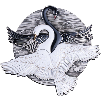 作为全球知名的钱币商,MDM Wholesale向来以创新设计与精湛工艺著称,而这枚“黑白天鹅”仿古银币更是将其设计理念发挥到了极致。这枚仿古银币的特色,在于摒弃了单一的天鹅静态造型,以一对黑白天鹅的求偶舞蹈为核心设计,将天鹅的动态美与情感美展现得淋漓尽致,同时结合异形币的创新形态、彩色珐琅与24K镀金等多元化工艺,让这枚仿古银币兼具视觉冲击力与艺术质感。